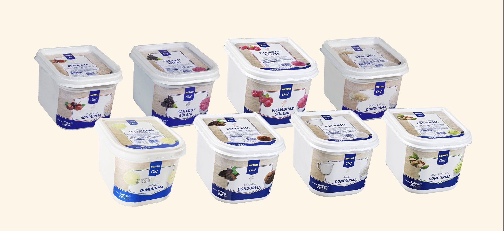 Koruyucu ve tatlandırıcı içermeyen, geleneksel dövme metodu ile hazırlanan Metro Chef dondurmalar, kalite ve lezzeti bir arada sunuyor. Antep fıstıklı, sade, kakaolu, Belçika çikolatalı, damla sakızlı, tuzlu karamelli, kestaneli, limonlu, frambuazlı ve karadutlu olmak üzere toplam 10 farklı çeşidiyle mutfaklarda tatlı sunumlarını bambaşka bir boyuta taşıyor. Üstelik %43-65 arasında değişen süt oranıyla dikkat çeken bu özel lezzetleri, 500 gramlık ve 1,7 kilogramlık farklı ambalaj seçenekleriyle Metro Türkiye mağazalarında bulabilirsiniz.