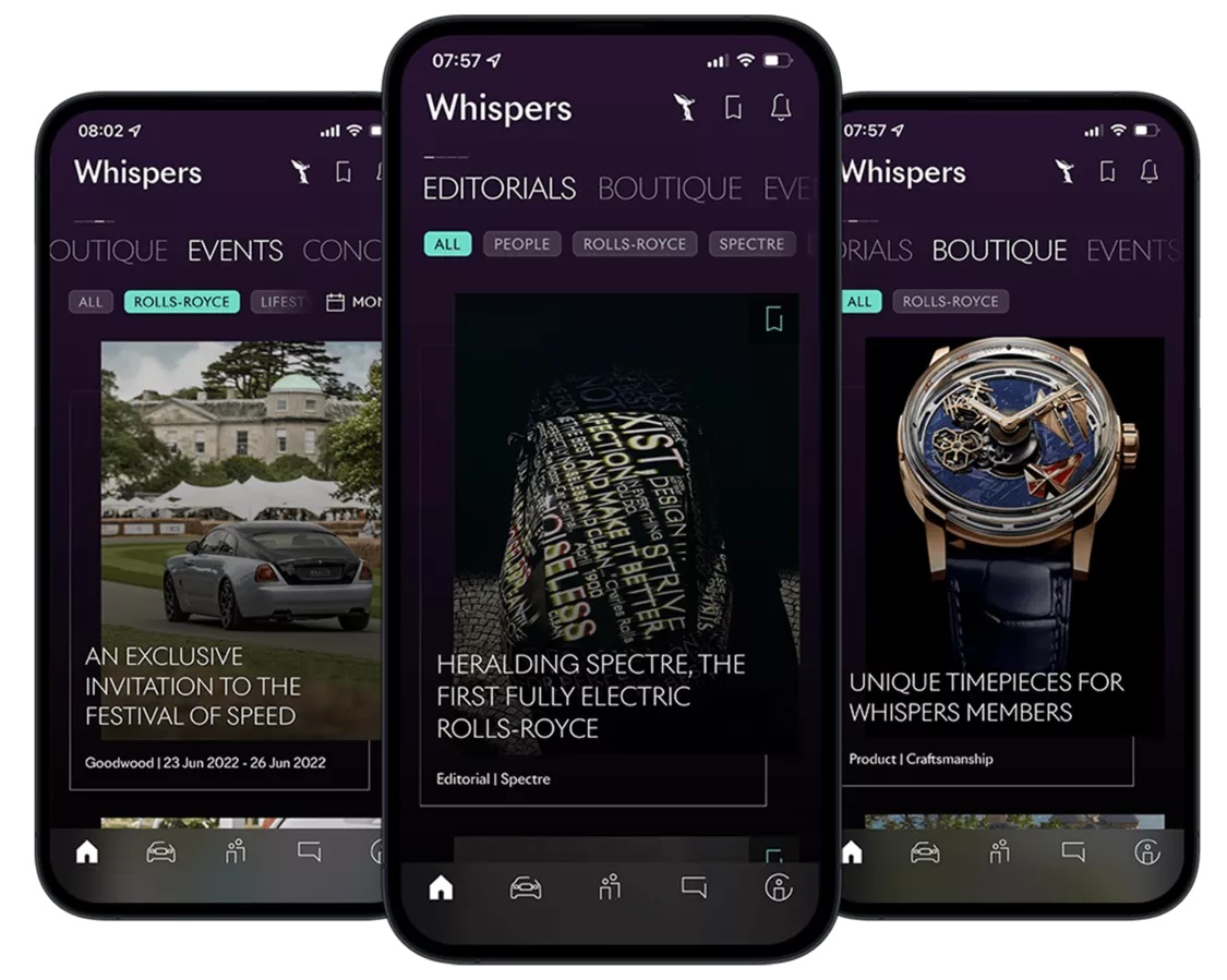 Rolls-Royce kullanıcılarına özel geliştirilen Whispers uygulaması ile markanın lüks ve özel deneyimi dijital dünyaya taşınıyor. Sadece Rolls-Royce sahiplerinin kullanabileceği, erişilmesi güç olan bilgilere ulaşabileceği, nadir keşifler yapabileceği ve benzer yaşam tarzına sahip kişilerle bağlantı kurabileceği özel bir dünya sunuyor.